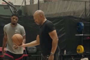 亨德森接受“老鱼”费舍尔特训指导,费舍尔直接脱掉球鞋,给亨德森讲解投篮时的脚步姿势。